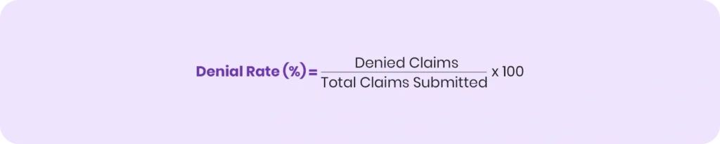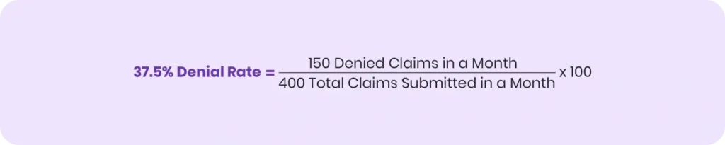 Example: A dental practice submits 400 claims in a month and experiences 150 claim denials. When it multiplies the result by 100, the denial rate is 37.5% for that month.