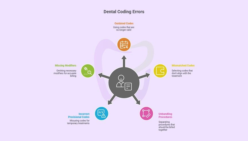 Using incorrect Current Dental Terminology (CDT) codes is a major source of claim denials. Procedure coding errors can occur due to outdated code knowledge, misunderstanding of code definitions, or selecting codes that don’t match the documented treatment.
