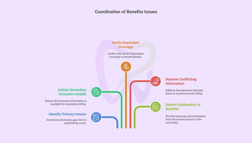 When patients have coverage under multiple dental insurance plans, coordination of benefits (COB) determines which plan pays first (primary) and which pays second (secondary). COB errors are a significant source of claim denials, particularly when the wrong insurance is billed first or when required information is missing.